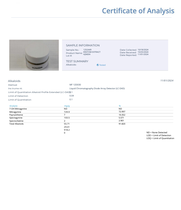 Our Kratom Extract, tested for Mitragynine content up to 75% MIT, is a nearly flavorless and odorless extract. This product offers a full spectrum of alkaloids, providing a potent and long-lasting alternative to traditional kratom powder.